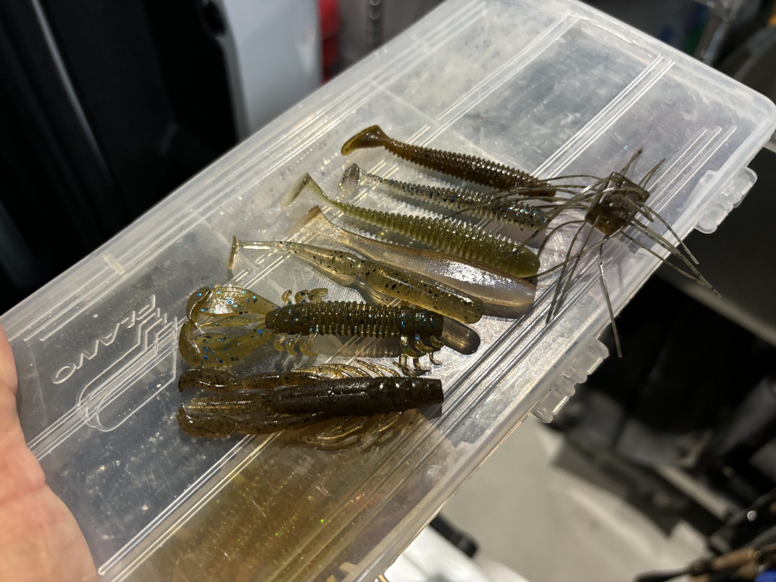 ハリーシュリンプにMSクロー、スイングインパクト2.5&3にシャッドインパクト、スイングベイト、レッグワームにサイコロラバー。