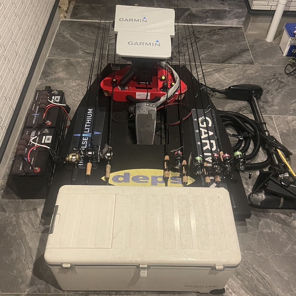 伊原くんは4月までにレンタルエレキ&バウデッキを中古で購入して、魚探類とバッテリーは普段浜名湖のマイボートで使用しているものを流用。