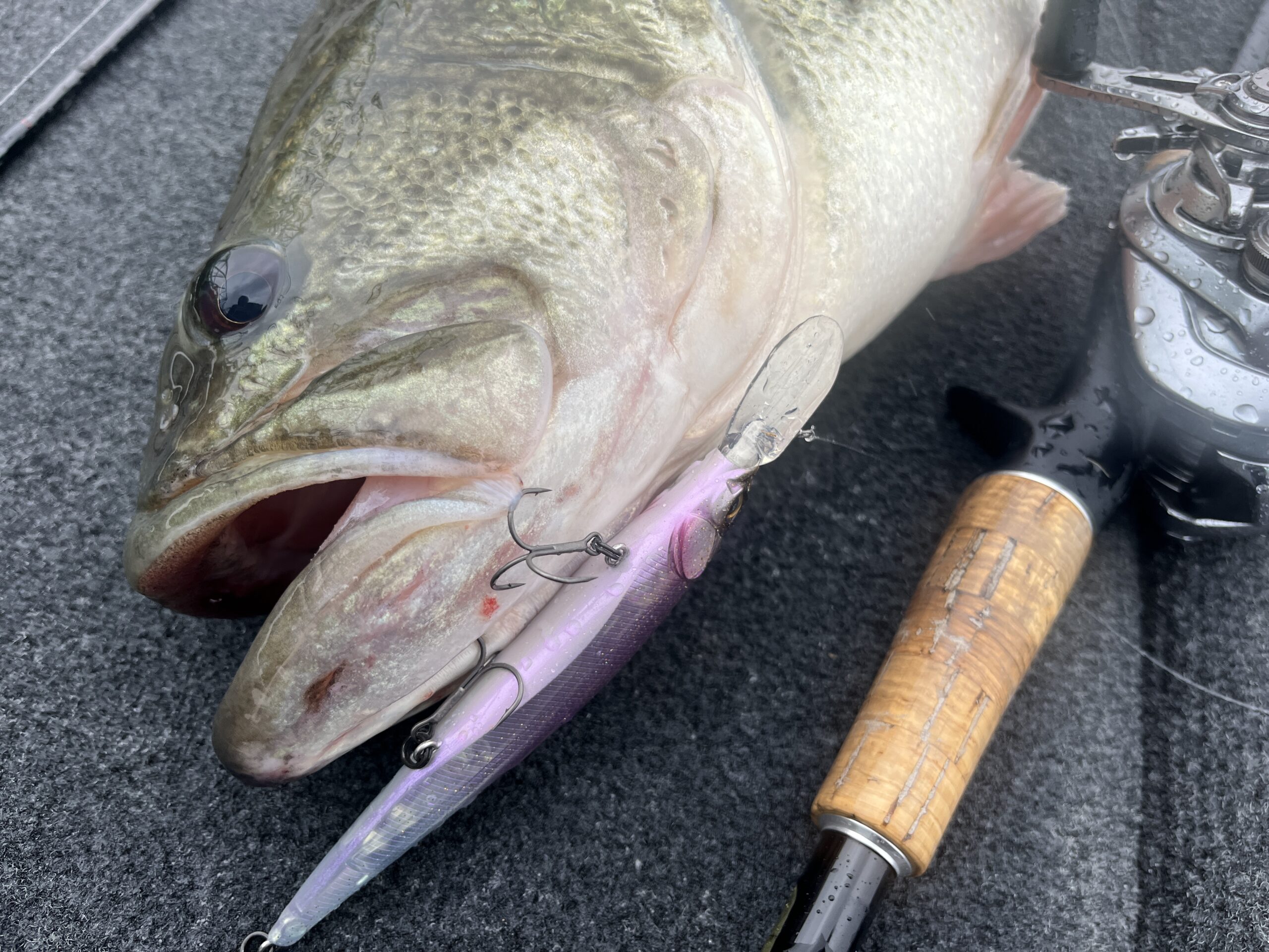 ただジャークベイトはバイブレーションやスピナーベイト(&クランクベイト)なんかと違って『巻きながら勝手に針が刺さる』がかなり少なく(バイブレーション、スピナーベイト、クランクベイトはリーリングがそのままフッキングになる)、加えて春に使う場合は魚がスローだったり、口を開けきれていないので、そこら辺を理解したトレブルフック(トリプルフック)が必要不可欠です。