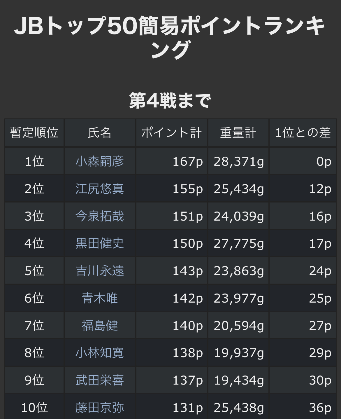暫定4位黒田シャロー×ライブスコープ、5位吉川プロサイト×ライブスコープ、6位青木プロ世界一のライブスコープと、小森さんとはスタイルが違う選手が並んでるからスコアが読みにくいはず(=これくらいなら負けないとかが読みにくい)。