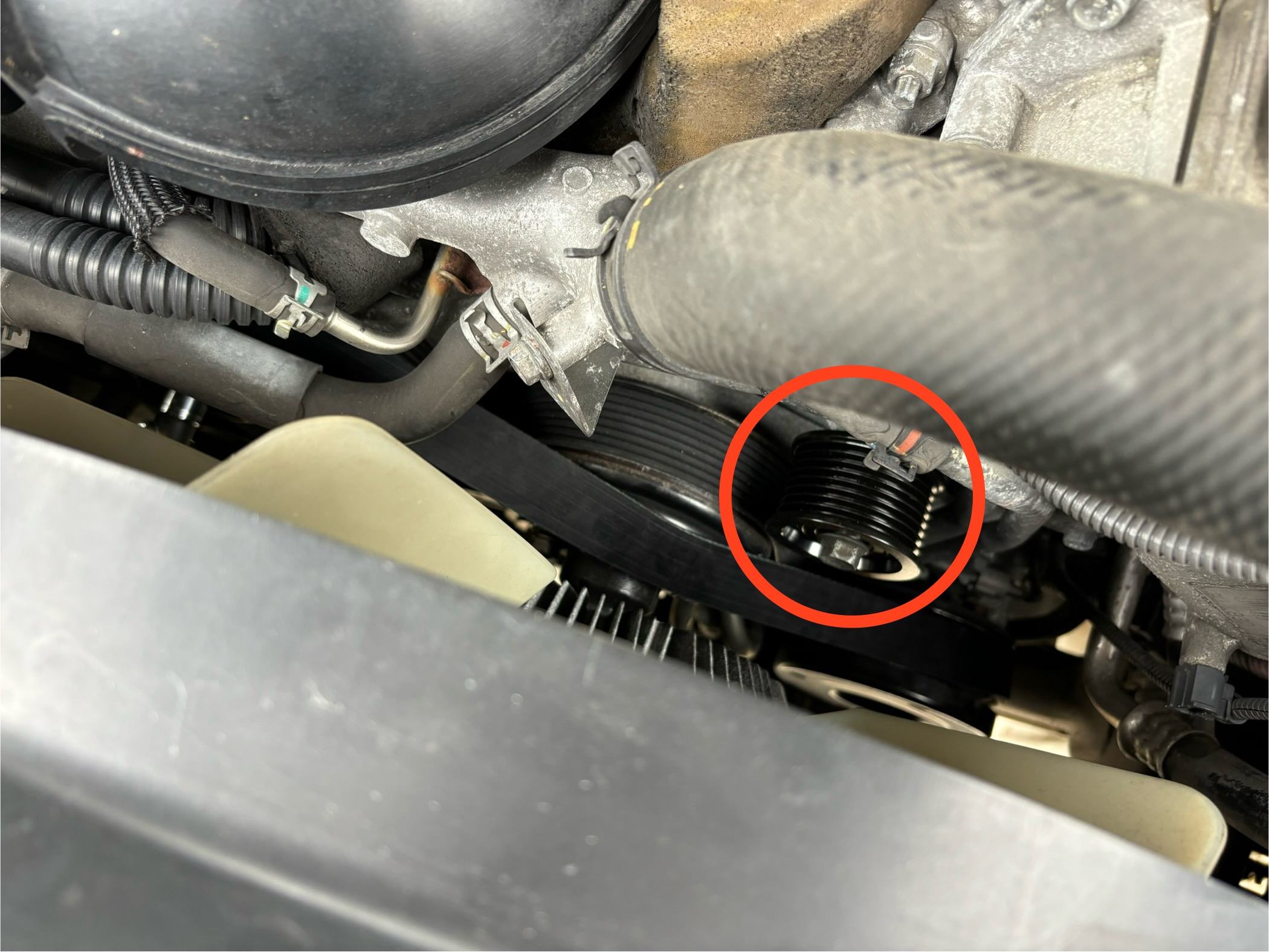 当たり前ですが、下で潜って誰かがテンショナーを緩めて(エクステンション使わないと300mmくらいのレンチじゃテンショナー緩みません)、もう1人が上から右上のプーリーにベルトを外したり、付けたりする必要があります。