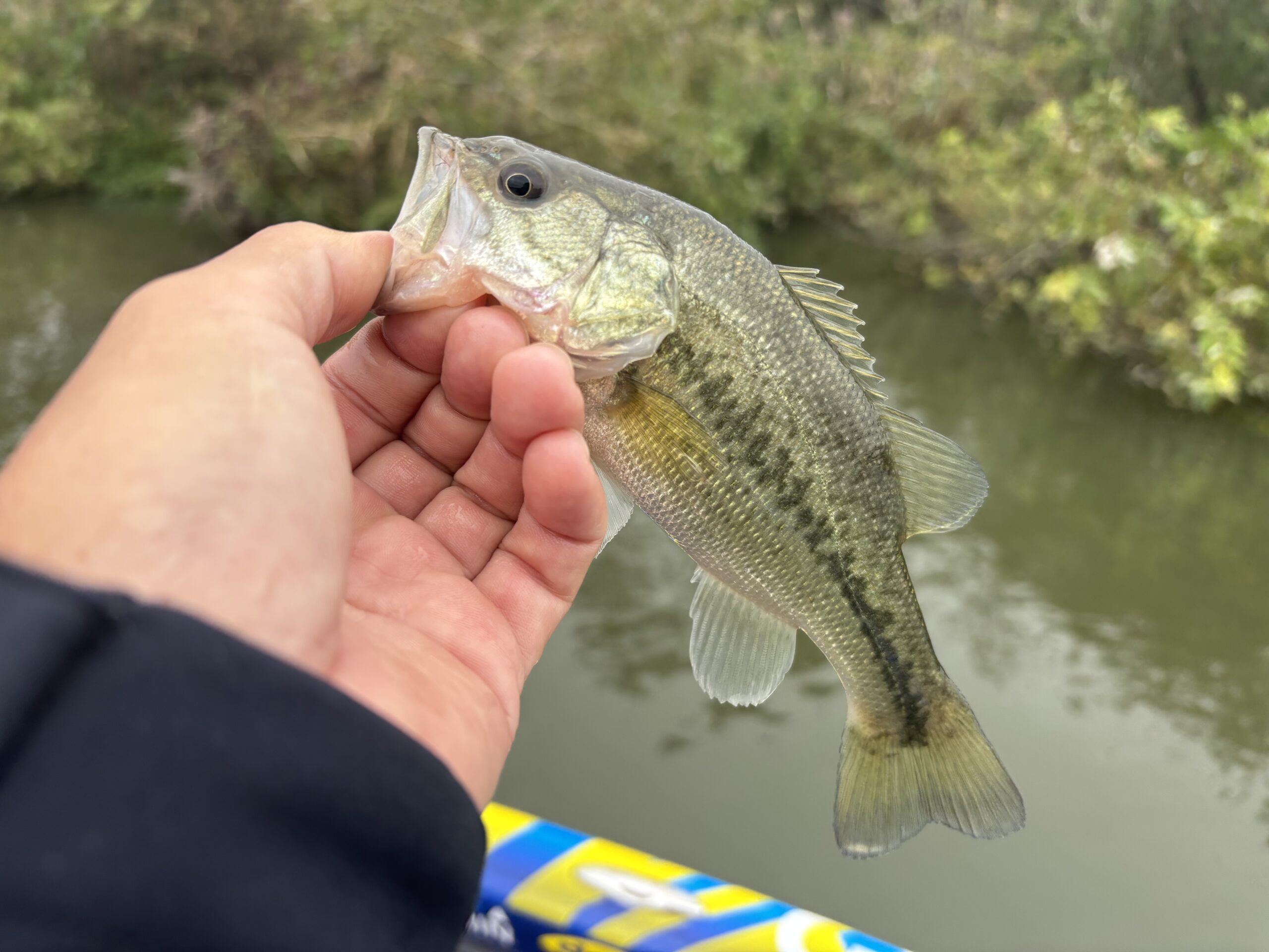 逆にちょっと沖目(と言って岸から2m離れてるだけとか)でちょっと水深がある場所の方がバイトが明らかに多く、そういった場所にあるストラクチャーや、バンクに落としても手前まで引っ張ってバイトを得るなんてことを心掛けて直前プラに臨みました。