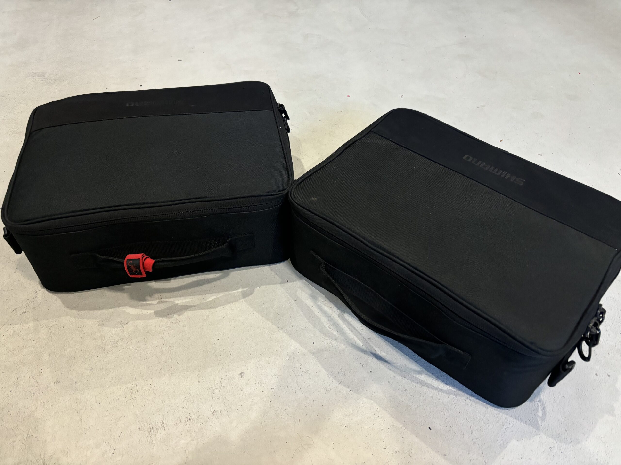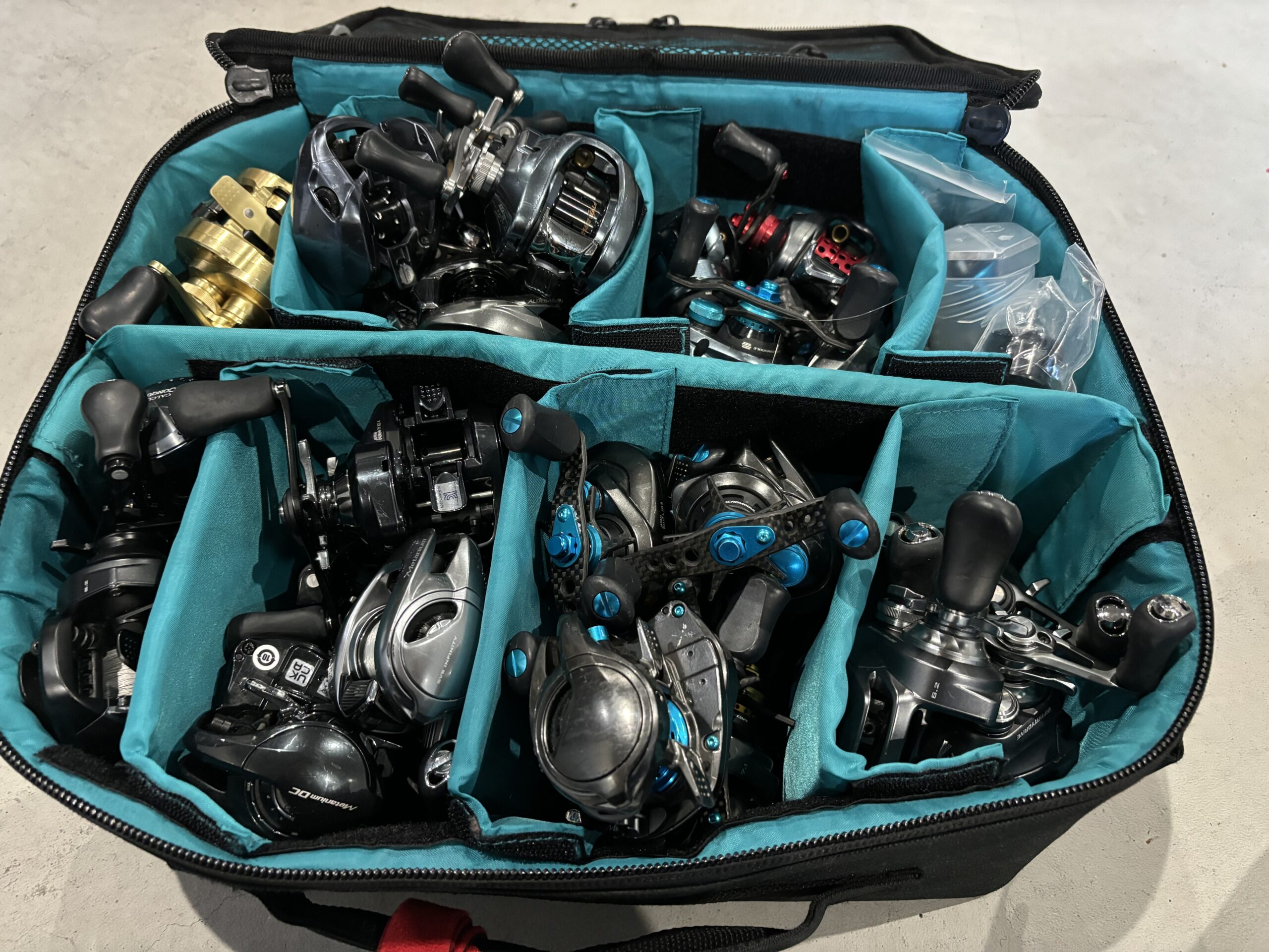 このポーチケースを2つ持ち歩くのはベイトとスピニングで分けているからで、ハンドル部に赤のロッドベルトを巻いてある方がベイトリールです。見分ける為に巻いています。